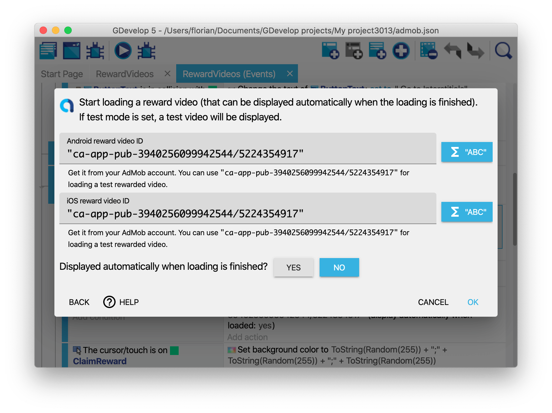 In the action, paste the ad unit id in the parameters (one for Android and one for iOS). Because parameters are string expressions, you must put the ad unit identifier between quotes.