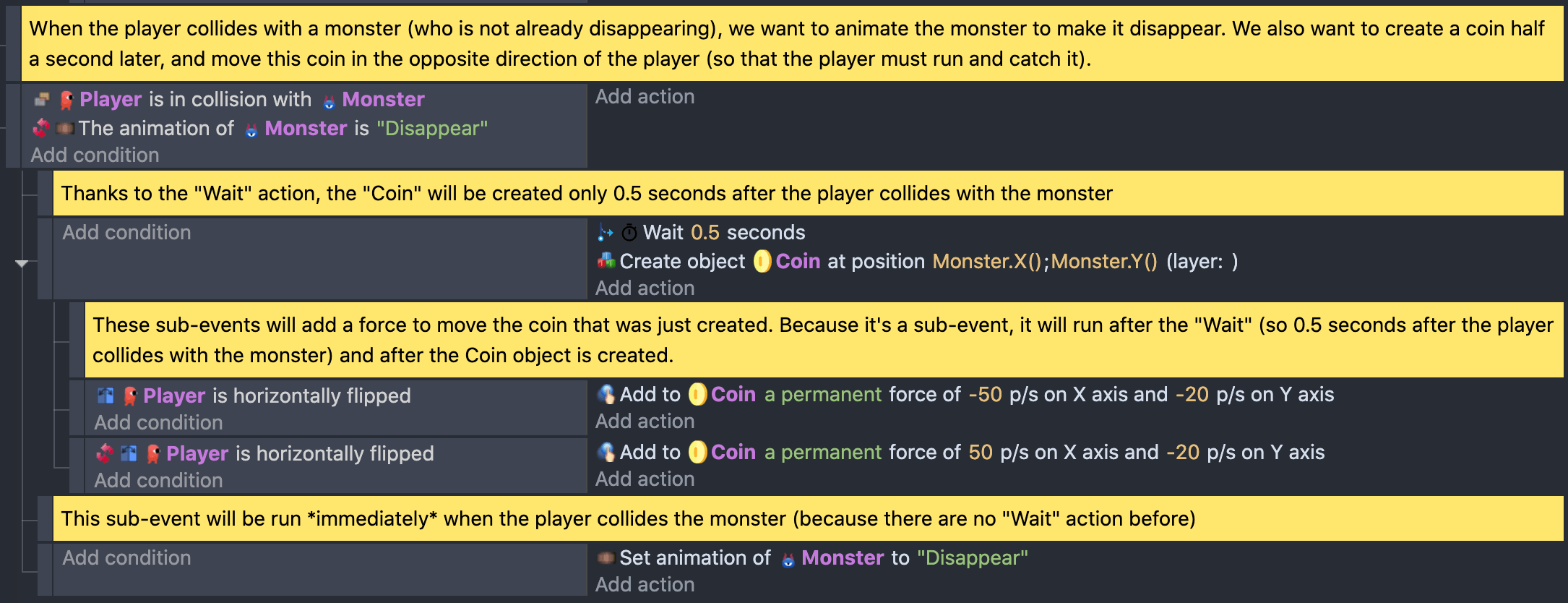 - Instead, prefer to use conditions like "At the beginning of the scene", a collision condition (with either a "Trigger Once" or an action to delete one of the object), etc...
