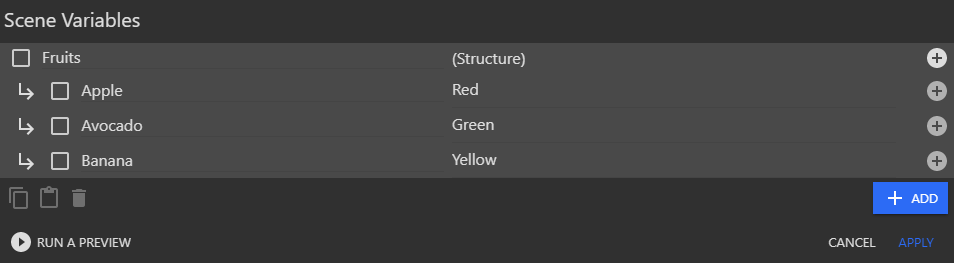 - Define a structure variable (Fruits) with multiple child variables (Apple, Avocado, Banana)