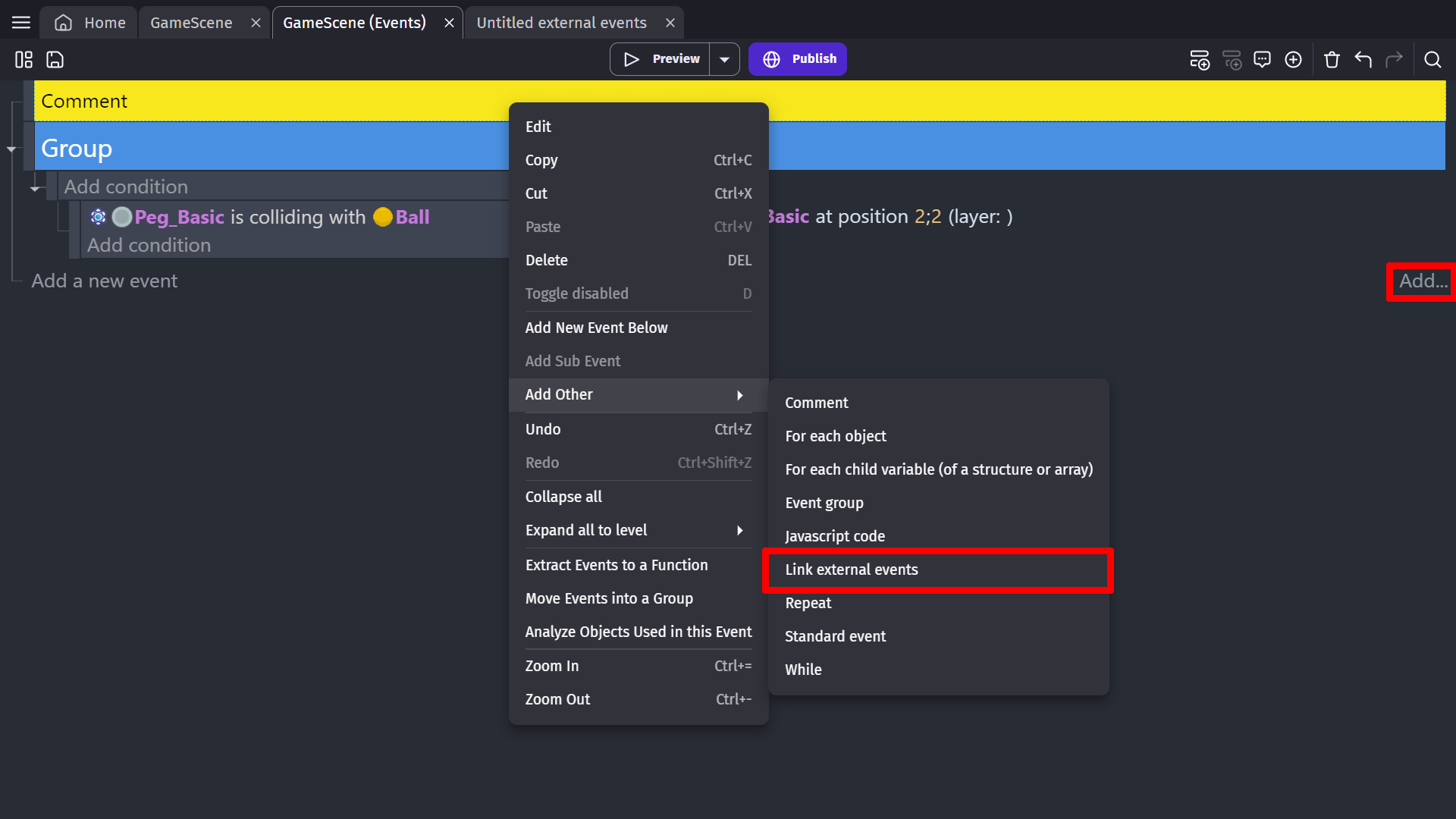 To create a link event, either click the "Add" at the bottom right side of the event sheet or right click on an existing event and open the drop-down menu for "Add Other", and then select "Link external events".