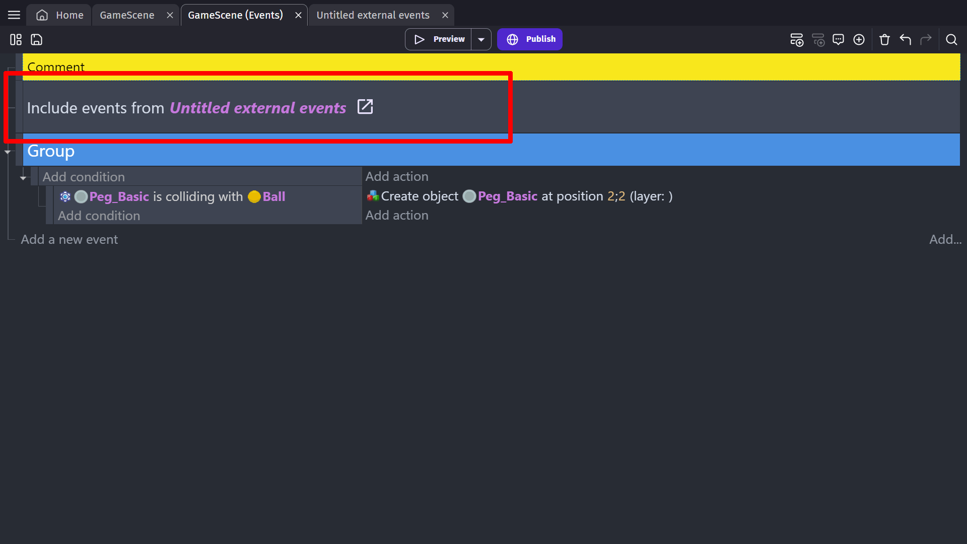 Link events are event blocks that link logic from external events or other scenes in your game to the event sheet they're placed in. Links indicate to GDevelop that events must be inserted at the position of the Link. These events can come from another scene in the game or from external events.