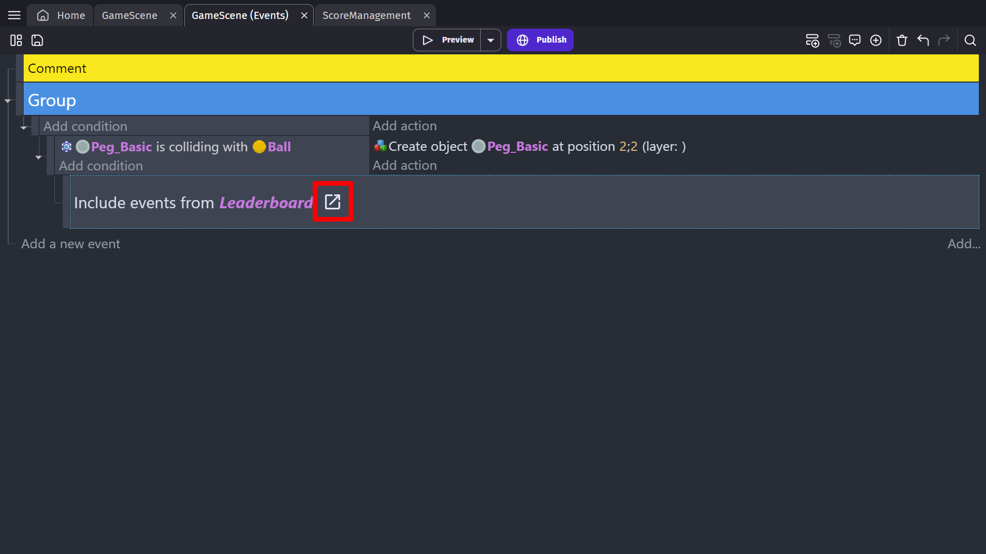 To open the linked event sheet, whether that's another scene in your game or an external event sheet, click on the arrow icon at the end of the linked event.