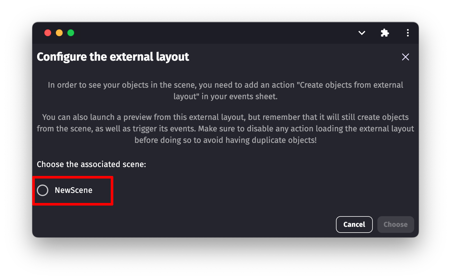 If you use this action, make sure to run it with either the At the beginning of the scene or Trigger once condition. Otherwise, new objects from this external layout will be created every frame, which will drastically reduce performance and create too many objects.