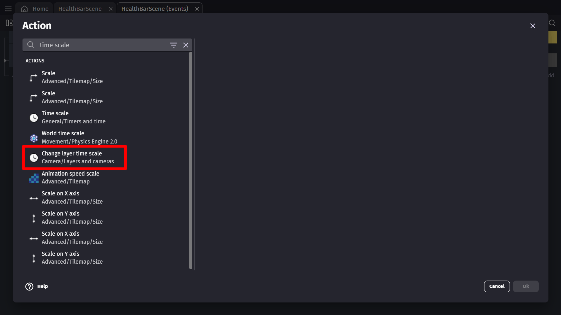 Time scale is the speed at which the game runs relative to the default speed, which is 1. This can be modified to slow down or speed up the game. Changing the time scale of a layer allows you to change the speed of everything happening in a single layer. To slow down the time on a layer, set the time scale to less than 1. To speed up the time on a layer, set the time scale to greater than 1.