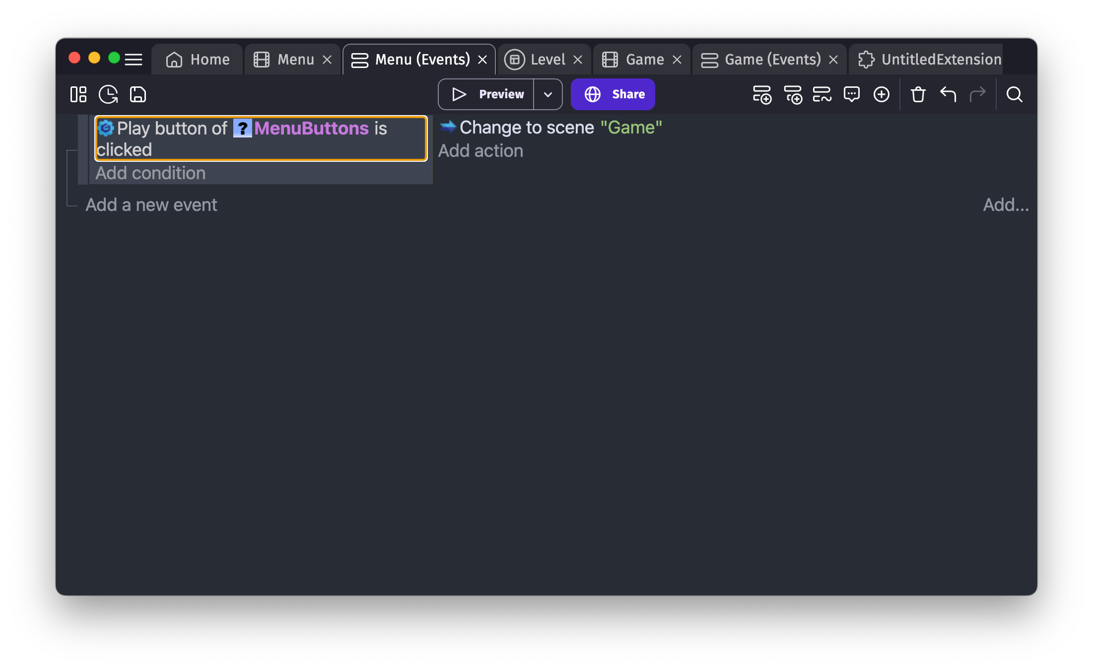 Of course, this example is pretty simple and just check if the button is clicked. But similar conditions and actions could be added to manipulate the custom object, and any logic you add here will work across all the scenes using the custom object.