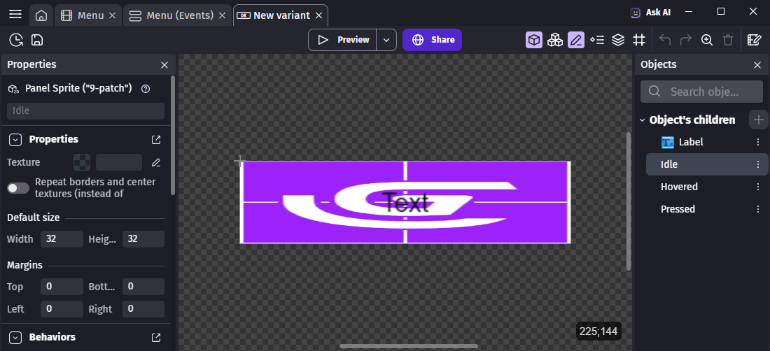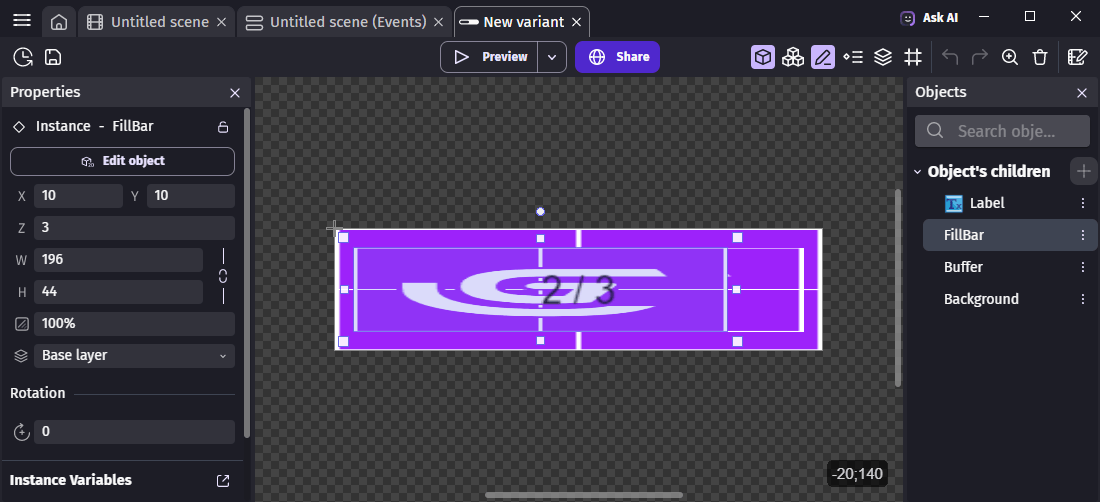 - Report your configuration on the Object's children on the left. For convenience, you may want to open your project backup in a second instance of GDevelop.
