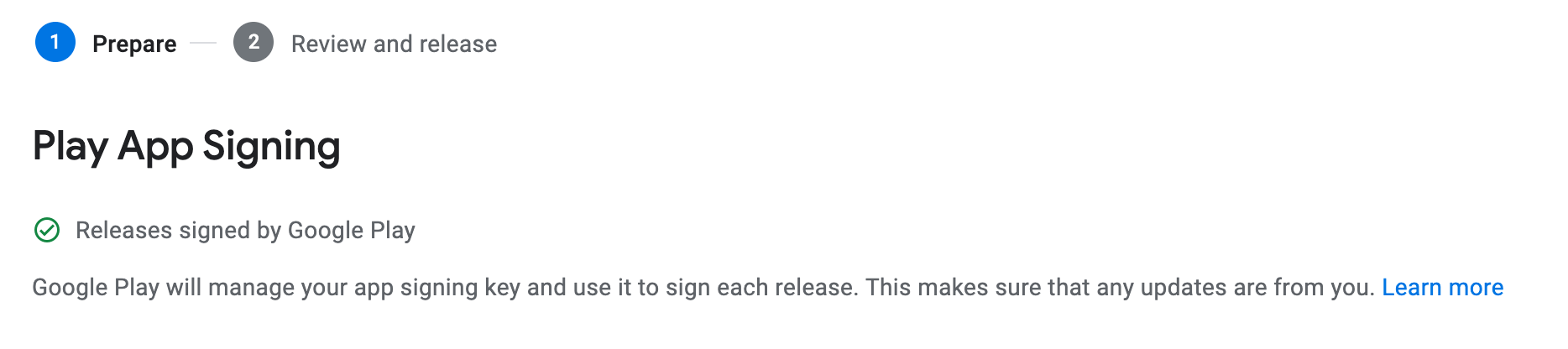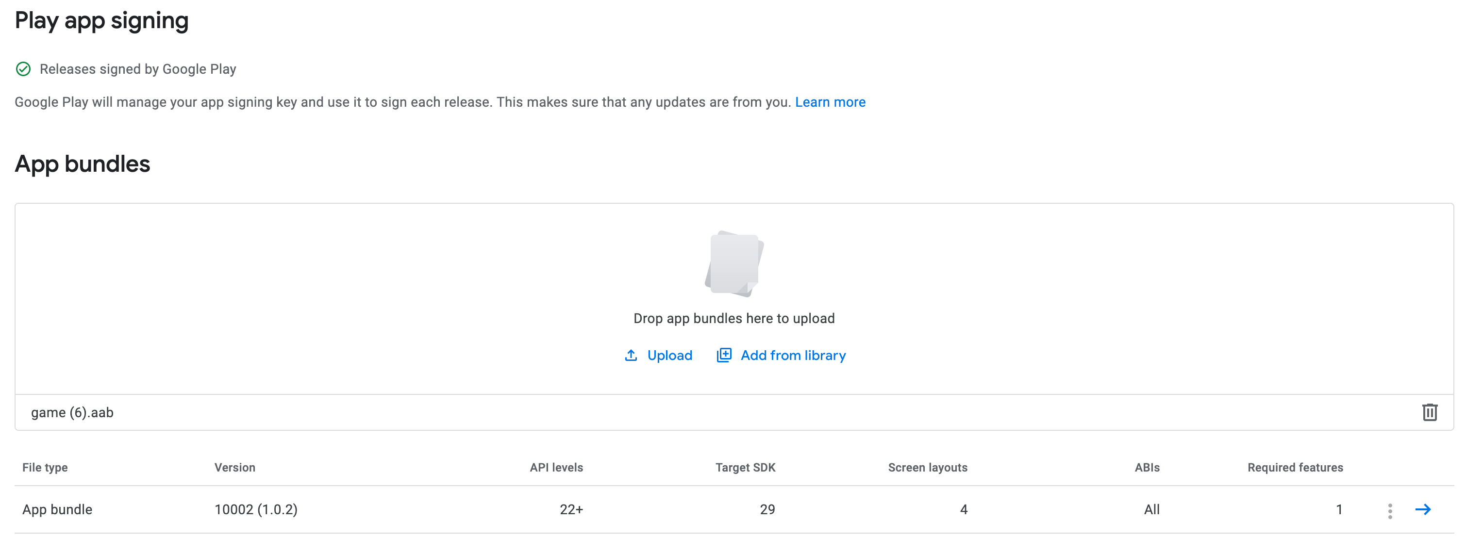 You should see in the screen to upload the Android App Bundles something indicating "Releases signed by Google Play". Click on Upload and choose the Android App Bundle (.aab) file that was generated by GDevelop: