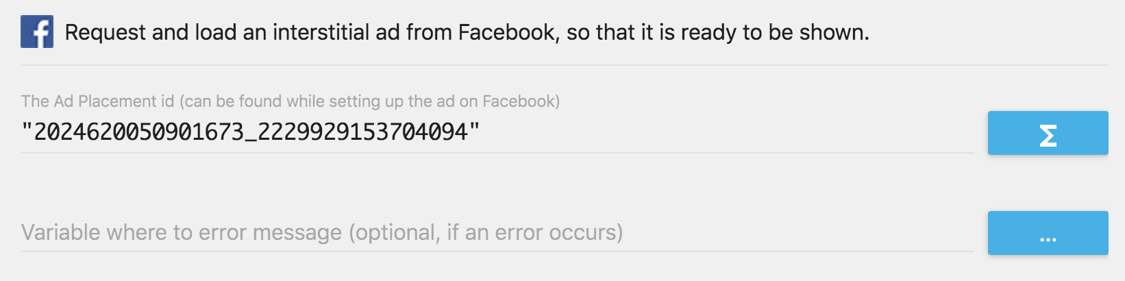 - Add an action "Load and prepare an interstitial ad" (in "Facebook Instant Games", "Ads").