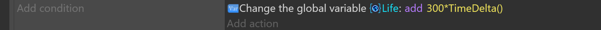The second event is correct and reliable : The number 300 is multiplied by TimeDelta(). Thus, the variable will be increased at the same rate on all computers. Because TimeDelta() returns a time in seconds, it allows you to quantify exactly how much the variable will change over time. In our case, the variable will grow at 300 units/second. Thus, we can predict that life will increase by 3000 units in 10 seconds, regardless of the number of frames processed during this time.