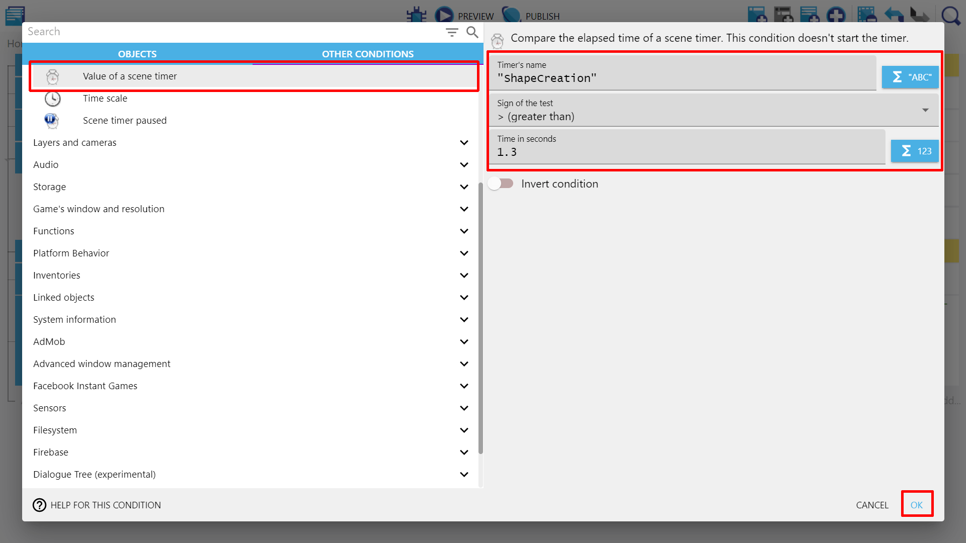 Next create a new event above the shapes event and give it the condition "at beginning of the scene", and copy/paste the earlier create "Start (or reset) a scene timer" action for "ShapeCreation" to this new event. This will start the timer at the beginning of the game in so the shapes event will trigger the first time.