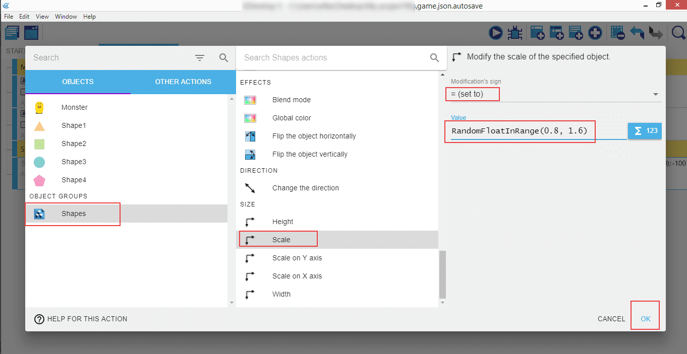 The three values we will enter are: "Text representing the name of the object to create", "X position", and "Y position". Name it "Shape" + ToString(RandomInRange(1,4))