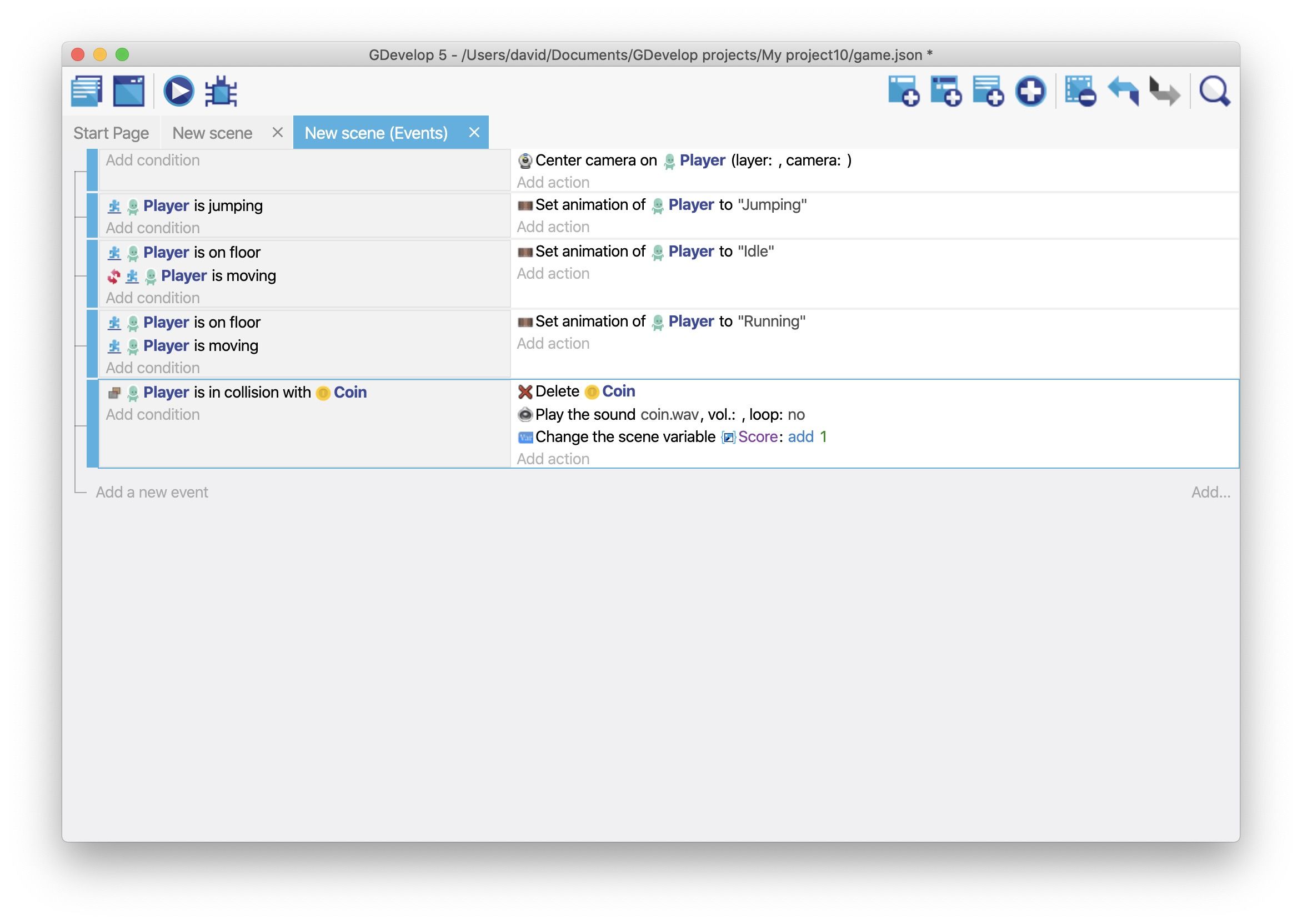 - Add a Play a sound action to the event that plays a sound effect when the player collects a coin. (You can use the "coin.wav" asset for the sound effect.)