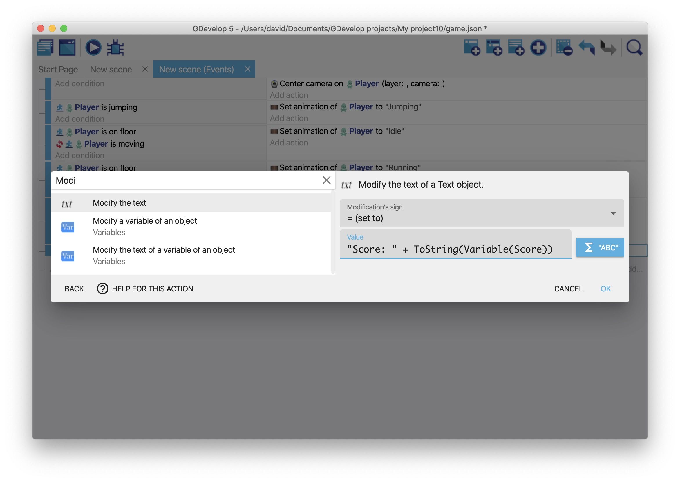 - Without specifying a condition, add the Modify the text action to the "Score" object. Because a condition isn't specified, this action runs in every frame. This ensures that the displayed score is always accurate.