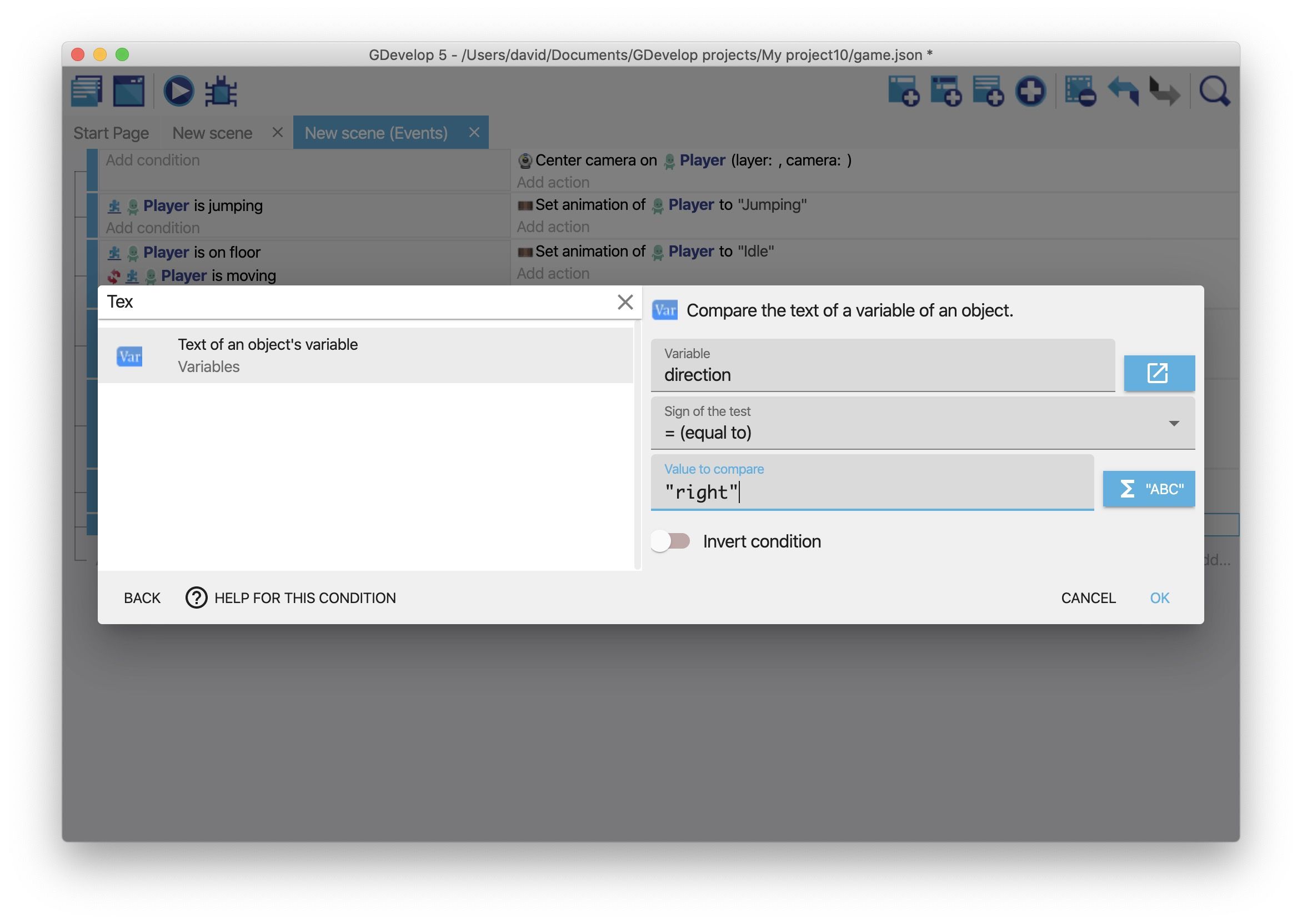- Add a variable named "direction" with a value of "right". This is the default value of the variable.