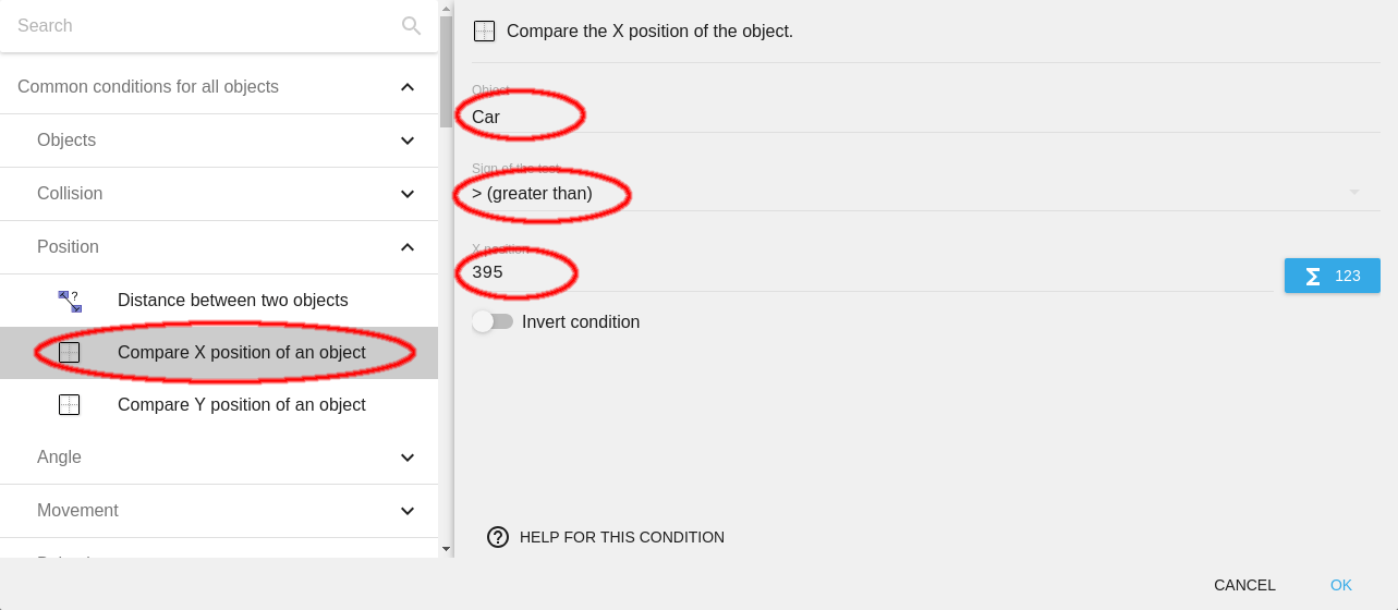 Our first event will include a condition that checks if the X position of the Car is less than 60 px.