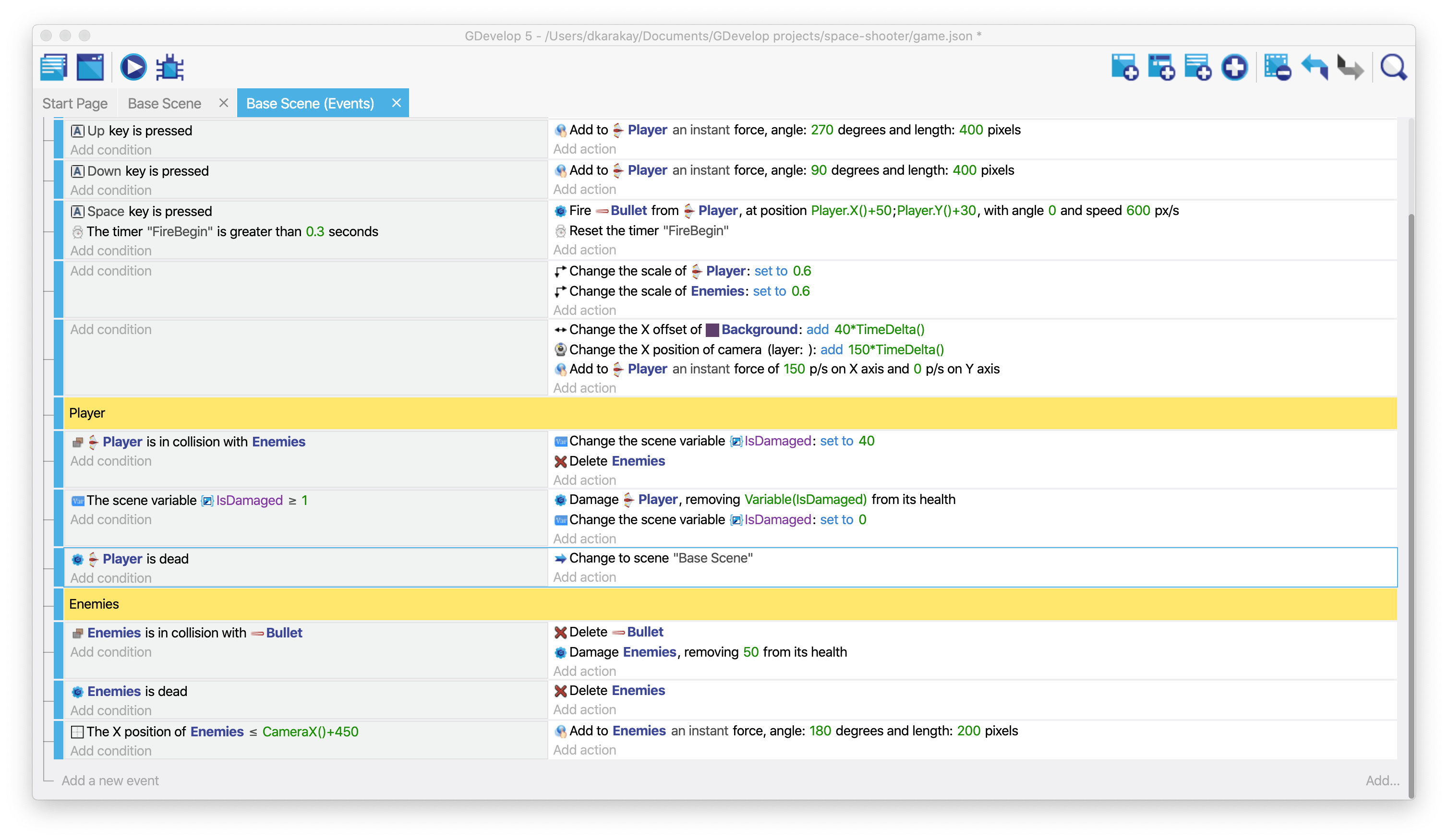Our game is over when the player is dead. Add a new condition to check the player is dead or not. Then, add an action to restart the game. Type ** "scene" ** on the search bar and select Change the scene. Just select the "Base Scene" or your scene's name.