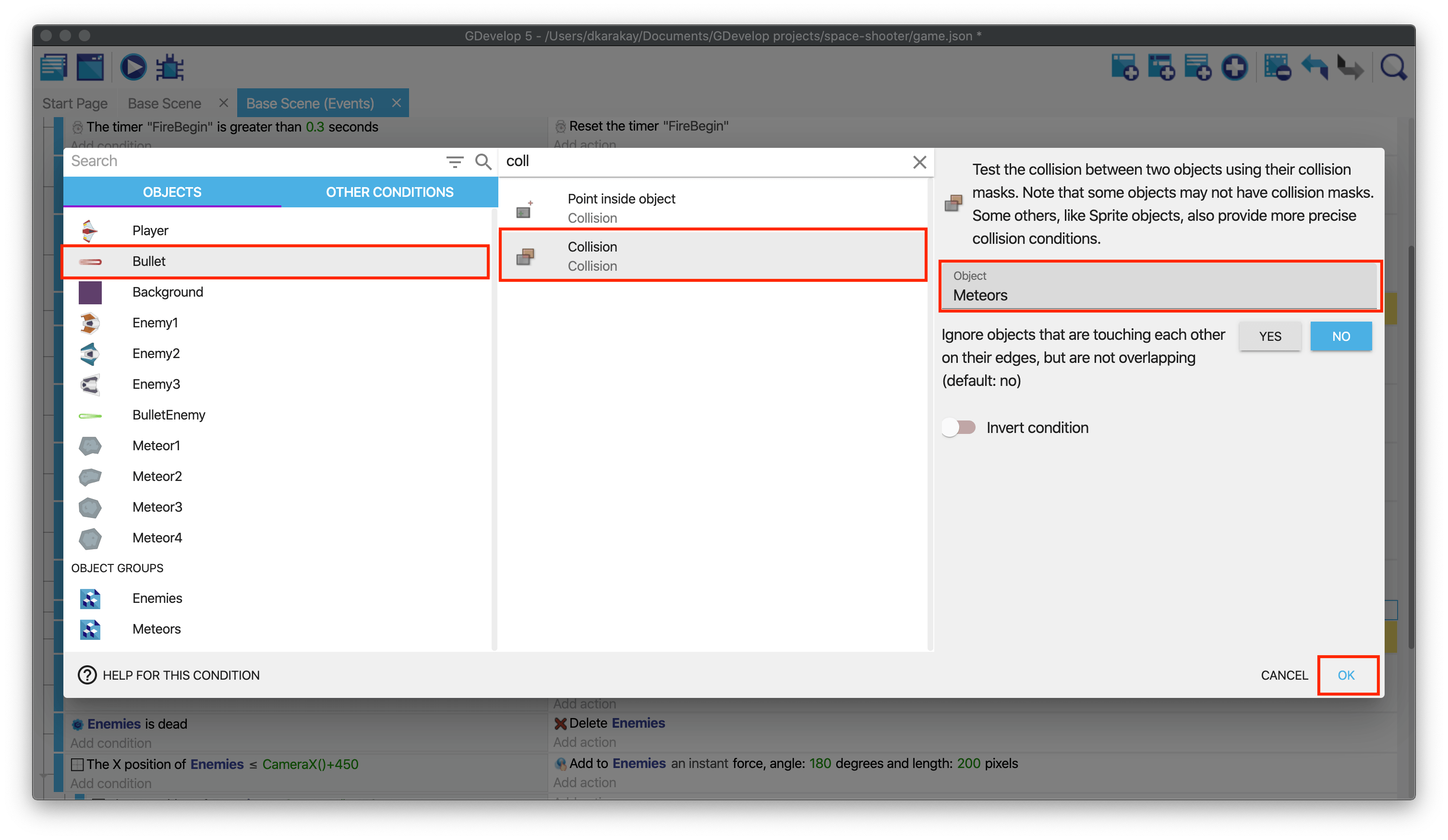 Open the Events tab and copy the condition and the action (Player collision with BulletEnemy), then paste it. Replace BulletEnemy in the condition and the Delete action with Meteors and ensure that IsDamaged is equal to 30.